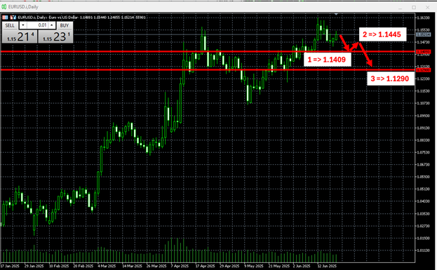 The EURUSD pair closed last Friday (20/06/2025) at 1.15214, and as markets reopens today (22/06/2025) at 10pm UK time, the pair will open with a downside gap around 1.1470. This bearish gap comes amid escalating tensions in the Middle East, raising investor caution and driving flows into the U.S. Dollar as a safe-haven currency.