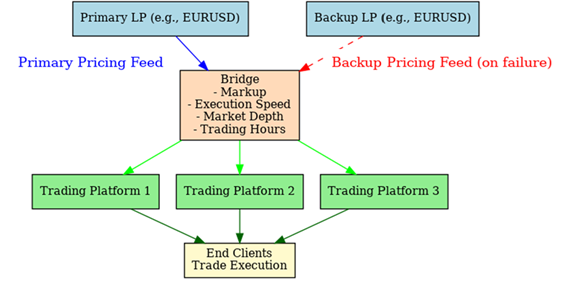 Each LP sends pricing data to the broker’s bridge. The bridge selects the best available prices and routes them to trading platforms. In case the primary LP feed fails, the system can switch to a backup LP, ensuring uninterrupted trading.