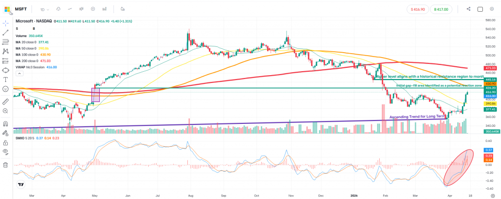 Microsoft’s recent price action shows a recovery phase following a broader pullback, with price attempting to stabilise after a sharp decline. The focus now shifts to how price behaves around key technical zones and whether momentum can sustain.