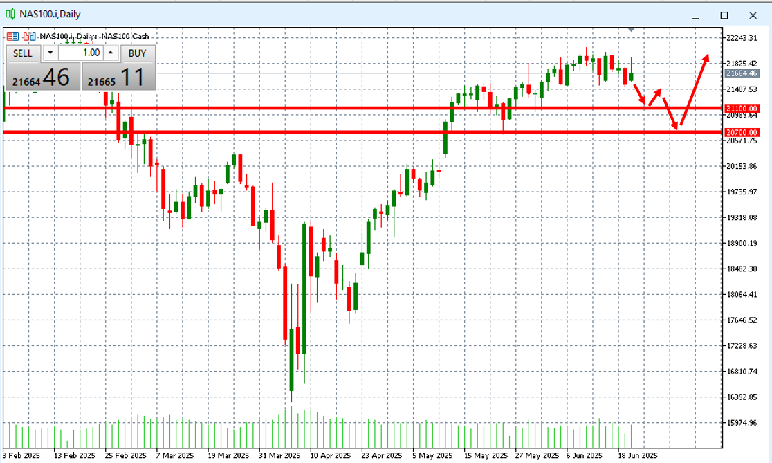 Since bottoming out in April near 16,200, the NAS100 has surged over 30% in just a few months. This parabolic move has now paused around the 21,600–22,000 zone, where historical resistance and technical overbought conditions are coming into play.