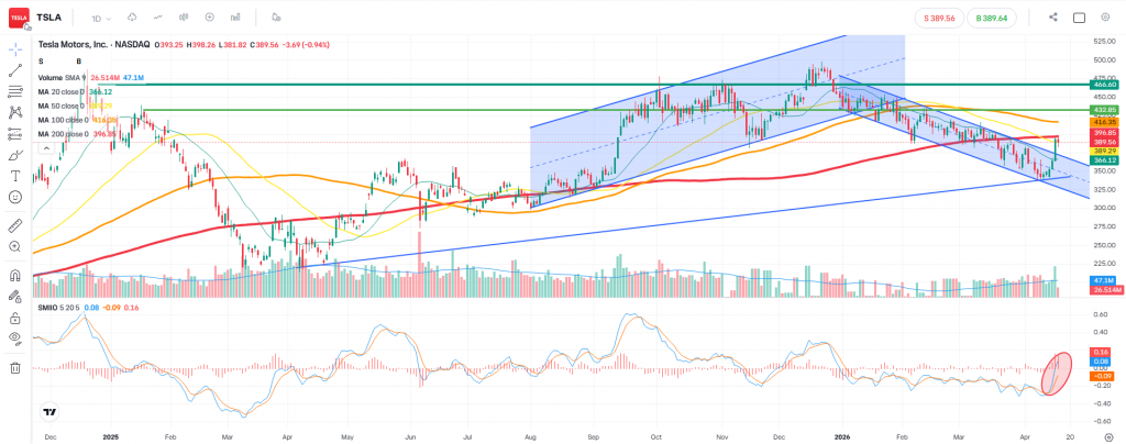 From a structural perspective, Tesla has transitioned from a strong bullish phase into a corrective environment, with price now trading within a short-term descending channel.
